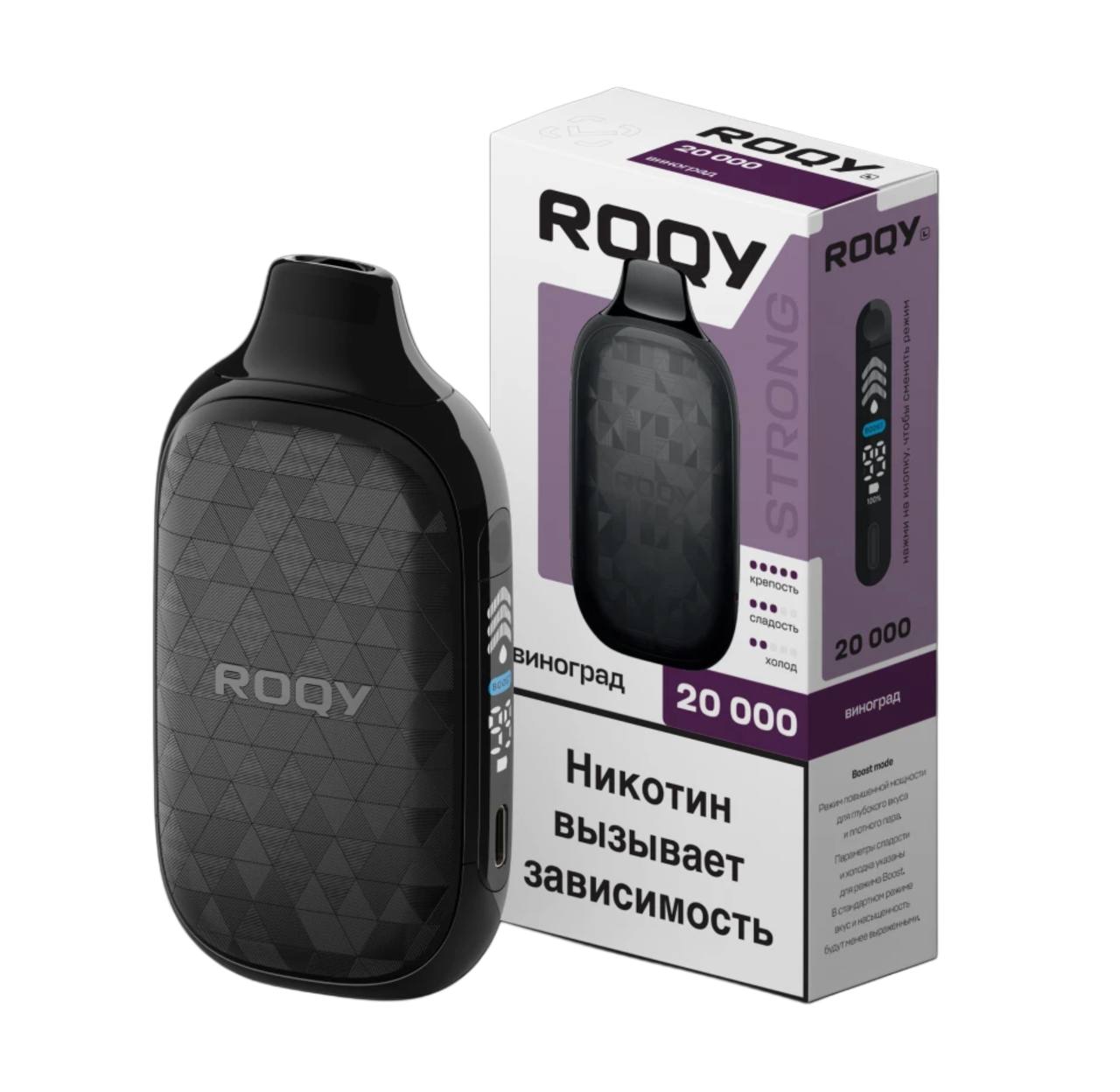 ROQY Strong — одноразовая электронная сигарета, обеспечивающая до 20 000 затяжек. Это ключевое устройство линейки ROQY, которое задаёт общее представление о её крепости.